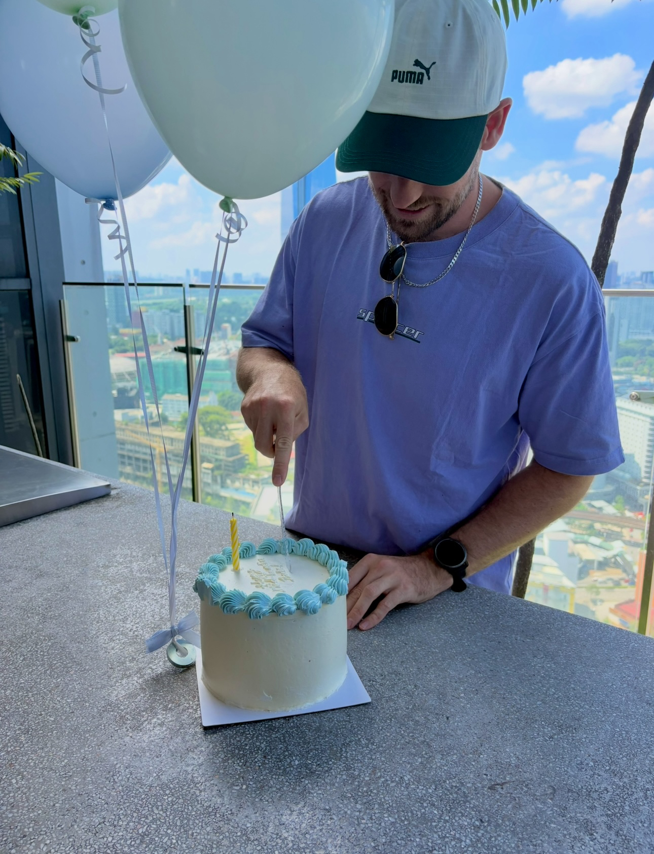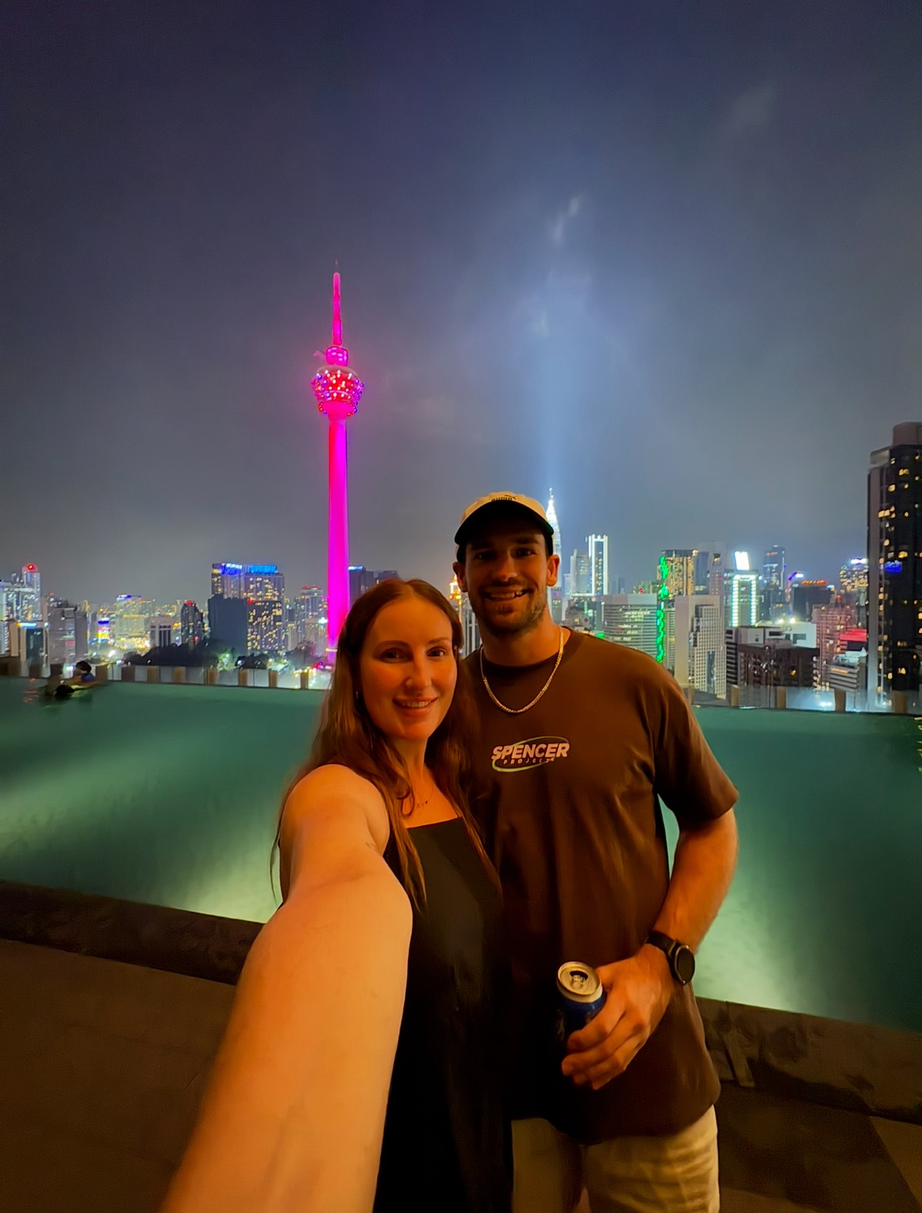 We kicked off Pat’s 25th birthday with a delicious breakfast at 103 Coffee, followed by a morning-tea break featuring a slice of Ferrero Rocher chocolate cake because everyone MUST have cake on their birthday. We ventured to Dark Horse Sports Bar to catch the Las Vegas NRL games, and thank goodness we made a booking… We had the whole place to ourselves! We spent hours there playing pool and some cards, and shared a parmy and mash for lunch–a classic Aussie comfort food. After a quick stop back at our apartment to freshen up, we headed to Helipad for drinks (yes, a helipad by day and rooftop bar by night). 360-degree views of the whole city at sunset, paired with a bottle of Argentinian wine, was the perfect way to toast the birthday boy. We could see the whole skyline from the bar, including the shimmering Petronas Towers, and the impressive Merdeka 118, one of the world’s tallest buildings (second only to the Burj Khalifa in Dubai).