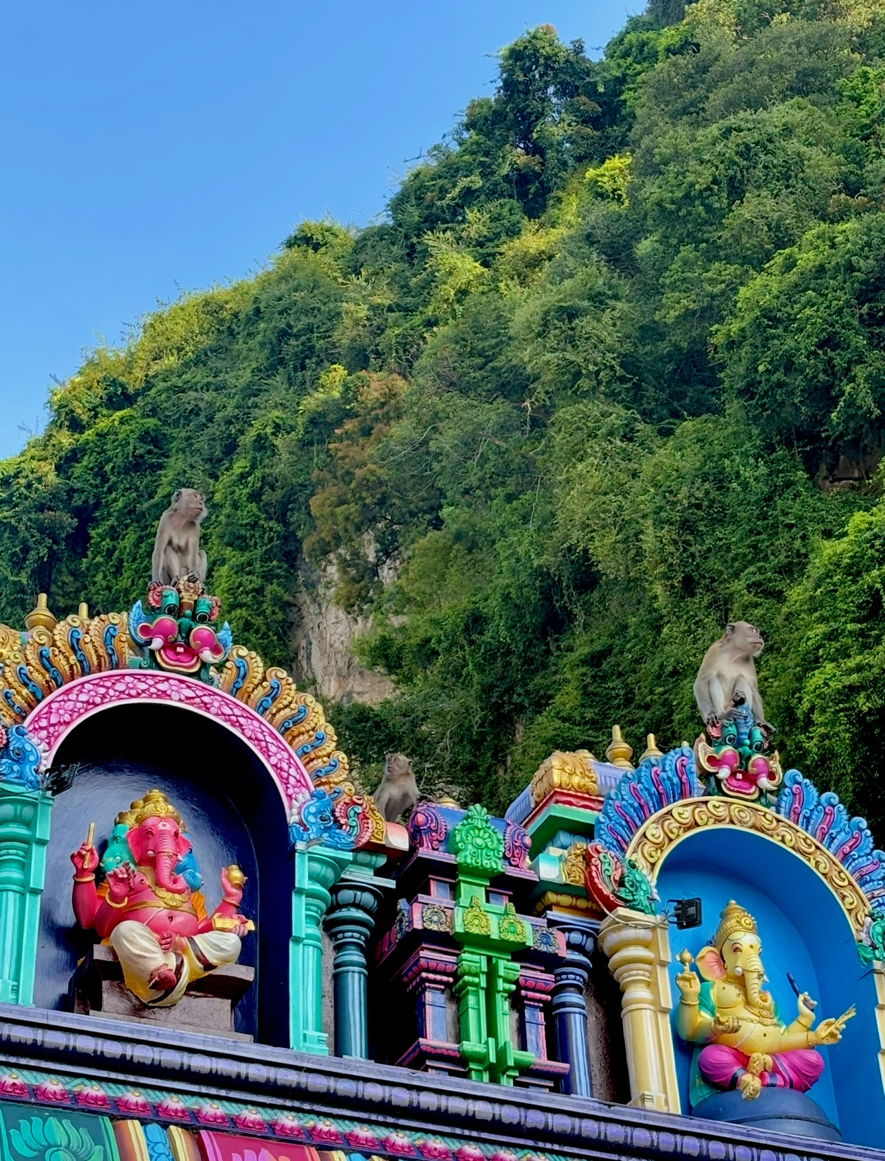 We squeezed in a trip to Batu Caves before checking out of our apartment. The Batu Caves are a series of limestone caves and Hindu shrines located just outside KL. The huge statue of Lord Murugan at the entrance stands at 42-ish meters, making it the tallest statue of a Hindu deity in Malaysia. KL seems to break records for a lot of the tallest things. We climbed the 272 colourful steps leading to the caves, passing mischievous monkeys along the way. Before leaving, we grabbed a somewhat unusual but delicious breakfast of cheese roti and curry puffs before boarding our LONG bus ride to Cameron Highlands.