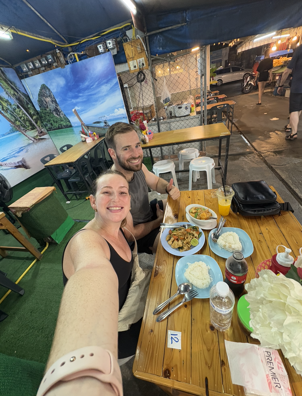 We finally met Noah for a delicious but mild Thai feed in Ao Nang, because a lot of food is Westernised for our taste buds. It gave us time to explore this lively and chaotic part of Krabi, filled with restaurants, bars, massage parlours (not just the remedial kind), and weed shops. For those who don’t know, marajuana is widely sold recreationally due to the grey area surrounding its decriminalised status in Thailand. So, you get used to seeing a weed symbol in every second shopfront… Anyway, after getting caught in the rain at the night markets, we headed “home” after a busy day of exploring. It was so nice to catch up and share dinner with Noah one last time.