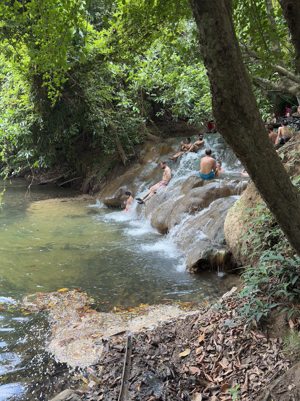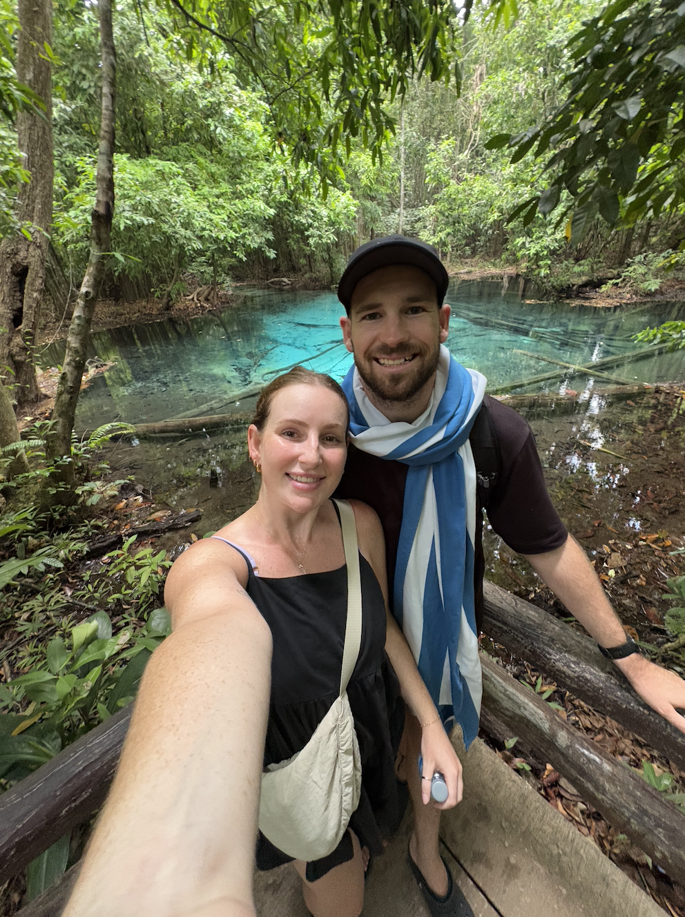 On our final day in Krabi, we took another tour to Namtok Ron Khlong Thom (hot spring waterfall), Sa Morakot (Emerald Pool) and Blue Lagoon. We didn’t enjoy this tour much. We’ve decided that we’ve done enough hot springs on this trip to last us until we have a desire to go to one, again. I don’t know… I just find them gross. They’re so HOT, filled with so many people (which also means bodily fluids), and it’s fresh water… So, there can’t be much hygiene going on. Also, going to a hot spring in 35-degree weather is stupid. While it’s lovely to see, it’s just not our thing. Emerald Pool was also disappointing. Pat took a dip with 50 other people, and then we were off to have lunch. Despite this, the Blue Lagoon was very nice. It’s non-swimmable because of its high temperatures and base being composed of quicksand.