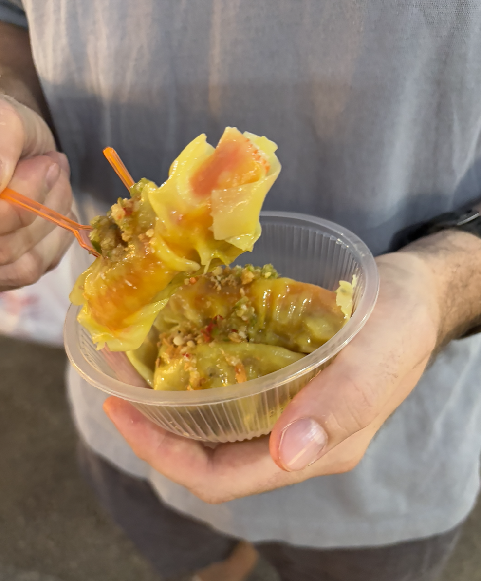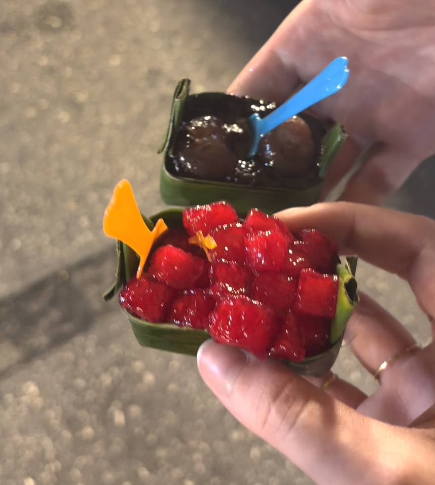 Later that night, we returned to Krabi Walking Street. We were determined to try as much local food as possible, for as cheap as possible. We started with spicy chicken skewers, and then tried a minced pork steamed bun and red bean steamed bun, a crab wonton and a minced chicken wonton, fresh strawberry smoothie and mango smoothie, banana roti (yum), fried chicken gyoza, chicken pad thai, Tako (traditional Thai coconut pudding dessert), and marshmallow brownie! Everything was delicious and all less than $20 AUD, so we made a TikTok about it. We went to bed in a food coma ready to leave Krabi the next morning.