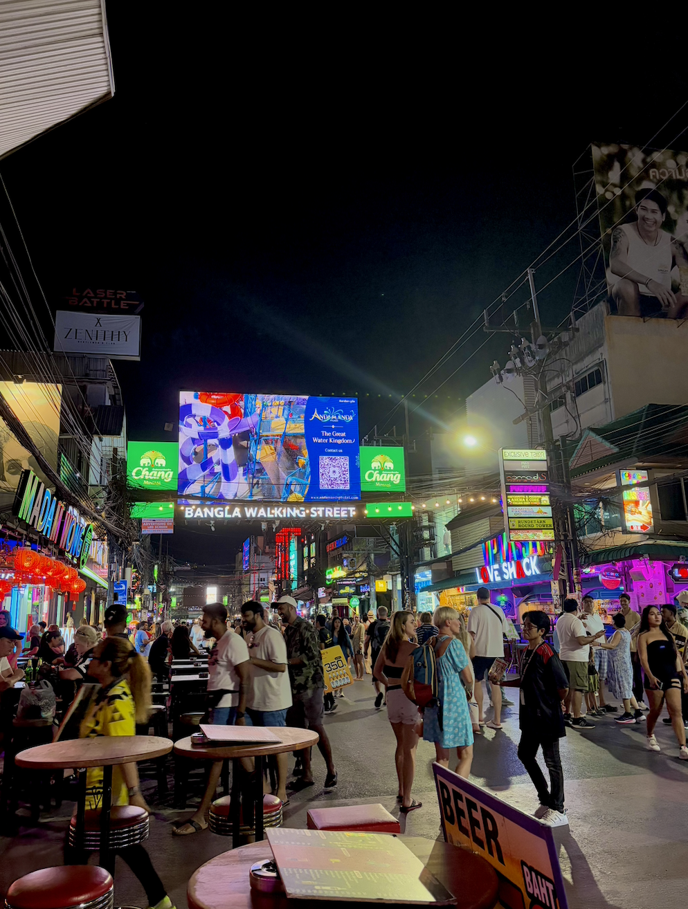 Before boarding the hottest and most crammed van we have ever been in, we went on a run around Krabi Town river, stopped at 7/11 for a protein shake, and then headed off. We arrived in Patong, Phuket mid-afternoon, which was a BIG change from Krabi. Patong is a beachfront town in the south-west of Thailand, facing the Andaman Sea. While we were bracing for some intense scenes, we could never have prepared for the chaos of Patong. It’s known for its noisy and jarring nightlife full of cocktail bars, nightclubs, massage parlours, ping pong shows (search at your own discretion), markets, and food stalls which predominantly line the famous Bangla Road. Once we settled into our accommodation (which was up five flights of stairs this time), we avoided the endless flyer handouts of Muay Thai fights and settled on Patong Beach to watch the sunset. We also had front row seats to Patong Beach paragliding. It was a beautiful and relaxing introduction to Patong, followed by a cheap dinner, people-watching at a bar on Bangla Road, another trip to 7/11 for dessert, and then sleeping.