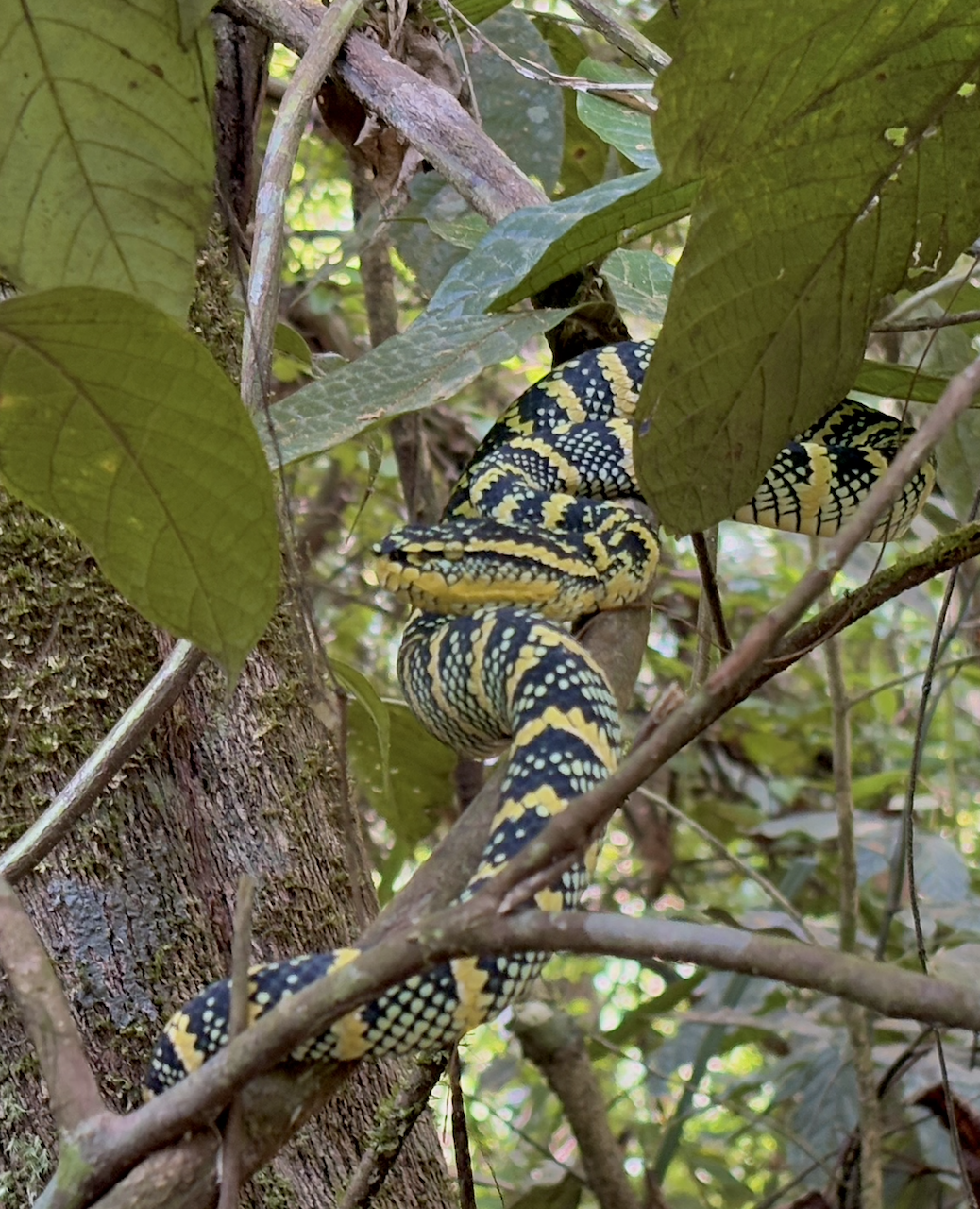 The next morning, we were collected from our cottages and taken to the entry point of Khao Sok National Park where we began our hike! We spent the day with a local tour guide who helped us spot all sorts of wildlife and shared many stories about the park, its nature, and inhabitants (which include wild elephants and tigers). Usually, the park is also full of streaming water and waterfalls, but the dry season drastically changes the landscape. It was very, very, very hot. We spotted a tarantula sleeping in its perfectly webbed nest, lots of monkeys and their babies, beautiful butterflies, a Great Hornbill, and a lot of Wagler’s palm pit vipers sleeping in trees (which are apparently endemic to Southeast Asia). We stopped for an hour and relaxed by the very low-tide stream, and then slowly headed back to the entrance. After about six hours of hiking (which wasn’t actually very far, just lots of stoppages), we enjoyed lunch back at the cottages, and played Bananagrams all afternoon.
