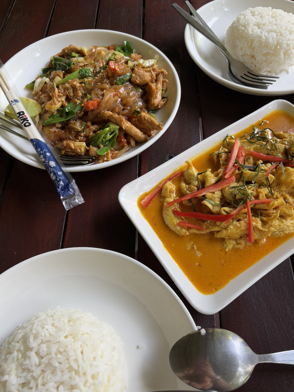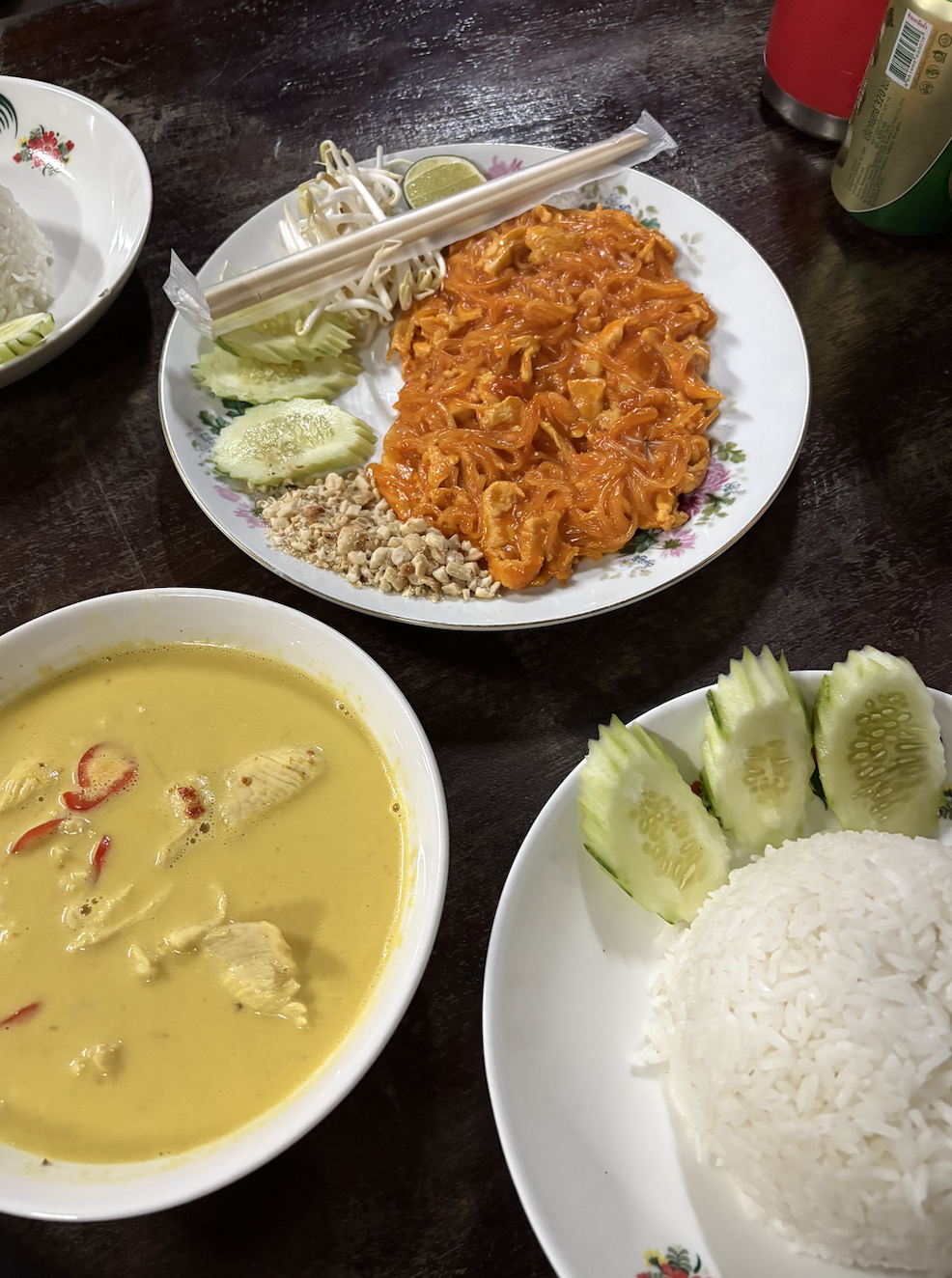 The next day, we were collected early for an adventure to Cheow Lan Lake, a stunning artificial lake covering 185 square kilometres of Khao Sok National Park. Boarding a longtail boat, we ventured down the lake and admired the towering limestone cliffs, groups of jumping monkeys, and stunning turquoise water. Eventually, we arrived at Diamond Cave where we needed to perform some parkour to get to the entrance. It was a very underwhelming cave, given hundreds of daily visitors have tarnished its natural beauty. Afterwards, we moved to the “swamp forest” where we were mentally prepared for a short trek. We soon realised a “short trek” meant about 200 steps in a loop while our guide explained the names and uses of different flora, including bamboo. Finally, it was time for lunch at the floating restaurant, where we enjoyed a buffet lunch of rice, barbecued fish, salad, curry, and pineapple. We spent the hour relaxing and swimming at the floating wharf before heading back to the pier to be taken home. It was a very expensive tour for what we experienced, but it was still a great way to see the lake up close.
