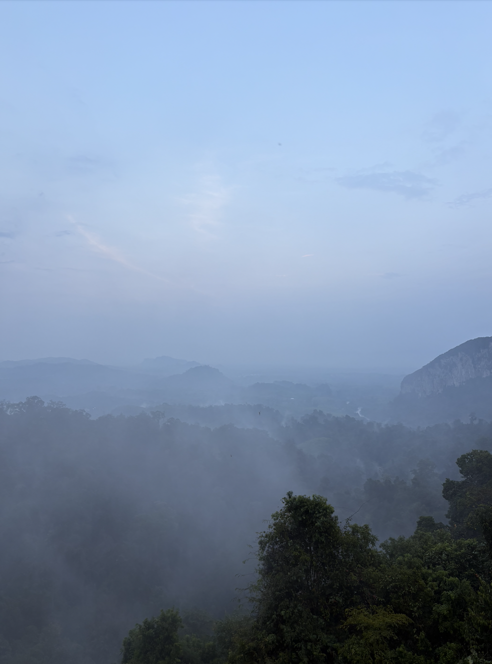 We arranged a sunset hike to explore a different park of Khao Sok National Park. We set off, with long sticks in hand to steady us, and learned so much from the local guide, who knew the park inside and out. We explored lots of caves, saw lots of huntsman spiders, frogs, tarantula nests, fossils which buried themselves in the limestone hundreds of years ago, and gigantic elderly trees (those that are softwood, because the hardwood trees have been deforested). Hundreds of bats were sleeping in all the caves, all of which would wake up and fly around our heads trying to avoid our flashlights. I was SO terrified. After a while, we were caught in torrential rain and sheltered in a cave waiting for the storm to pass. It seemed to rain forever, and we were finally rescued by one of Don’s sons, who was armed with ponchos and umbrellas. Before returning home for a shower, we stopped off at Khao Tor lookout, where we admired the valley and Cheow Lan Lake, which was blanketed by the post-storm mist. It was so quiet and serene–a very memorable hiking experience.