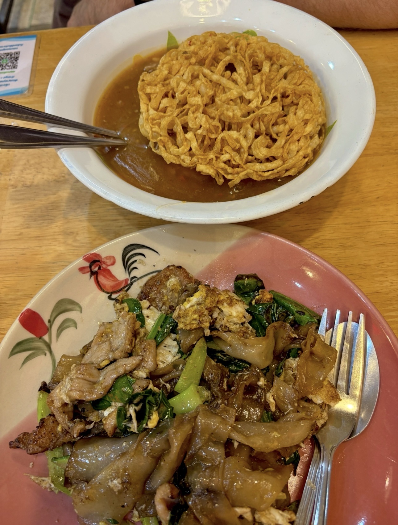 Navigating the Thai bus system, we hopped on a local bus which was a ”ride” in itself. The bus doesn’t fully stop; it just slows down and you have to jump on. You pay the conductor mid-roll and off you go. Very efficient! After our park adventure, we were back on Banthat Thong Road (we couldn’t stay away). We discovered a Michelin-rated restaurant, and enjoyed the tastiest flat fried noodles we’ve ever had. I want to go back just thinking about it.
