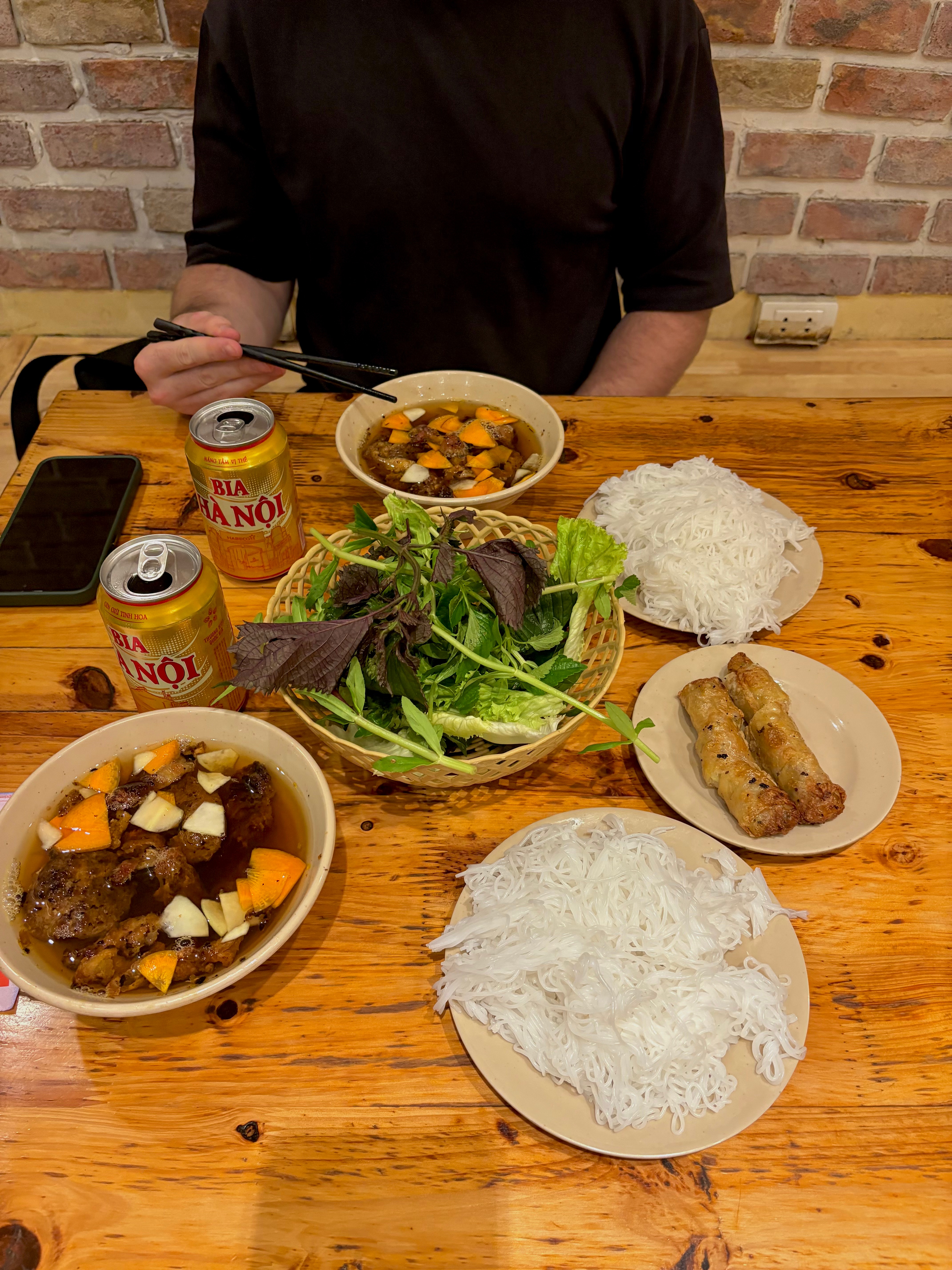 Dinner was bún chả at Bún Chả Ta, one of Hanoi’s Michelin Guide restaurants. Imagine grilled pork served in a bowl of sweet-savory broth with rice noodles and herbs. It’s messy, smoky, and absolutely delicious, especially when washed down with a cold Bia Hà Nội.