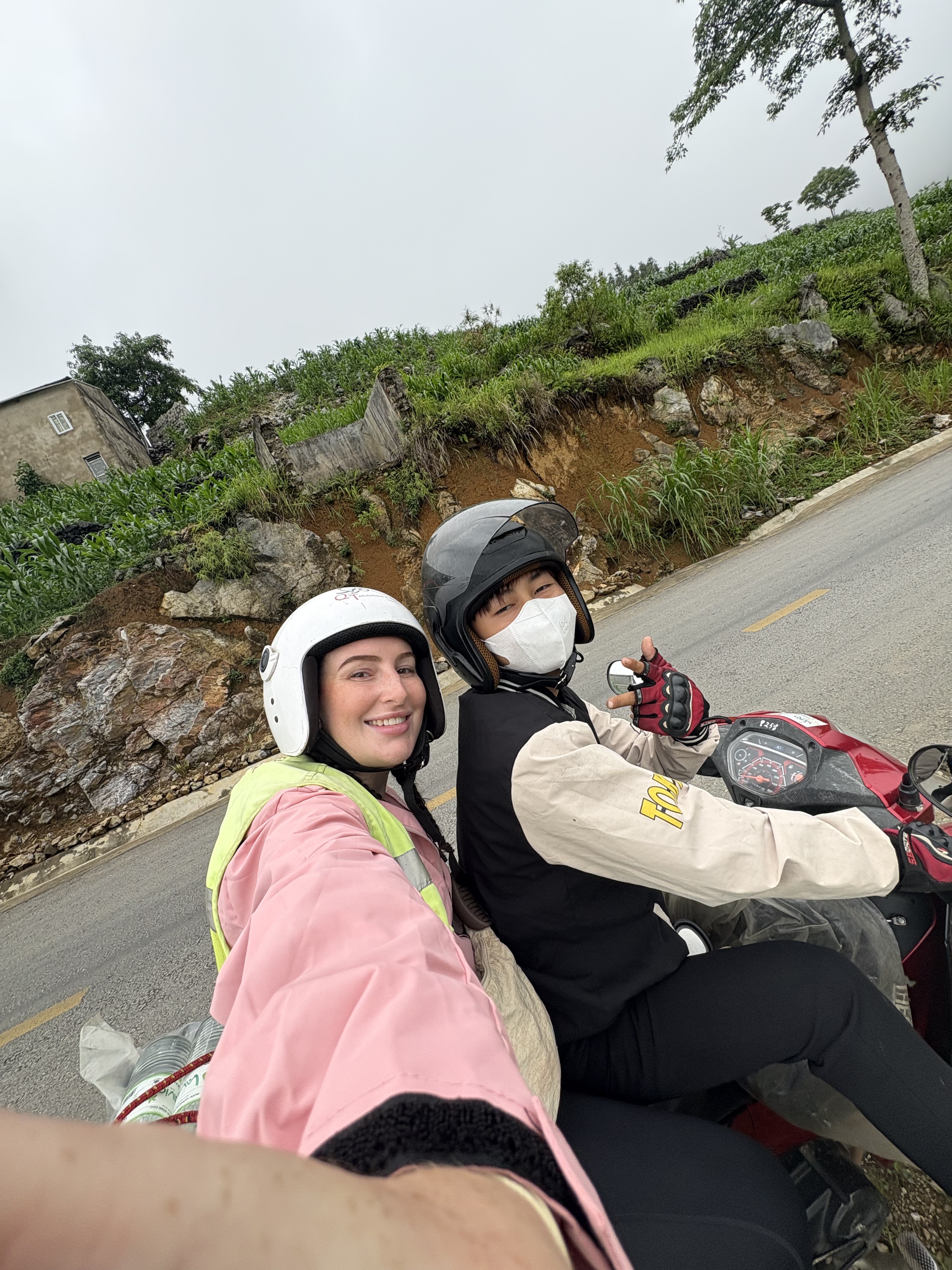 Then came the moment of truth: meeting our easy riders, the people we would quite literally be straddling for three days straight. I was nervous. Pat was introduced to a very kind, enthusiastic, super tall Vietnamese local named Huy, who Pat describes as “a great guy”. I was introduced to Pó, a quiet, kindhearted 18-year-old local who immediately won me over. Pó helped me on and off the bike every time, fastened and unfastened my helmet, made sure I had water, and checked I was okay at every single stop (of which there were many). My nerves didn’t last long; Pó is one the most gentle souls I have ever met. Naturally, we grew closer to our easy riders as the days went on, though our conversations were limited to the essentials: the few Vietnamese and English phrases we both knew, and Google Translate. Eventually, the most common phrase between us all became “đi thôi,” meaning “let’s go.”