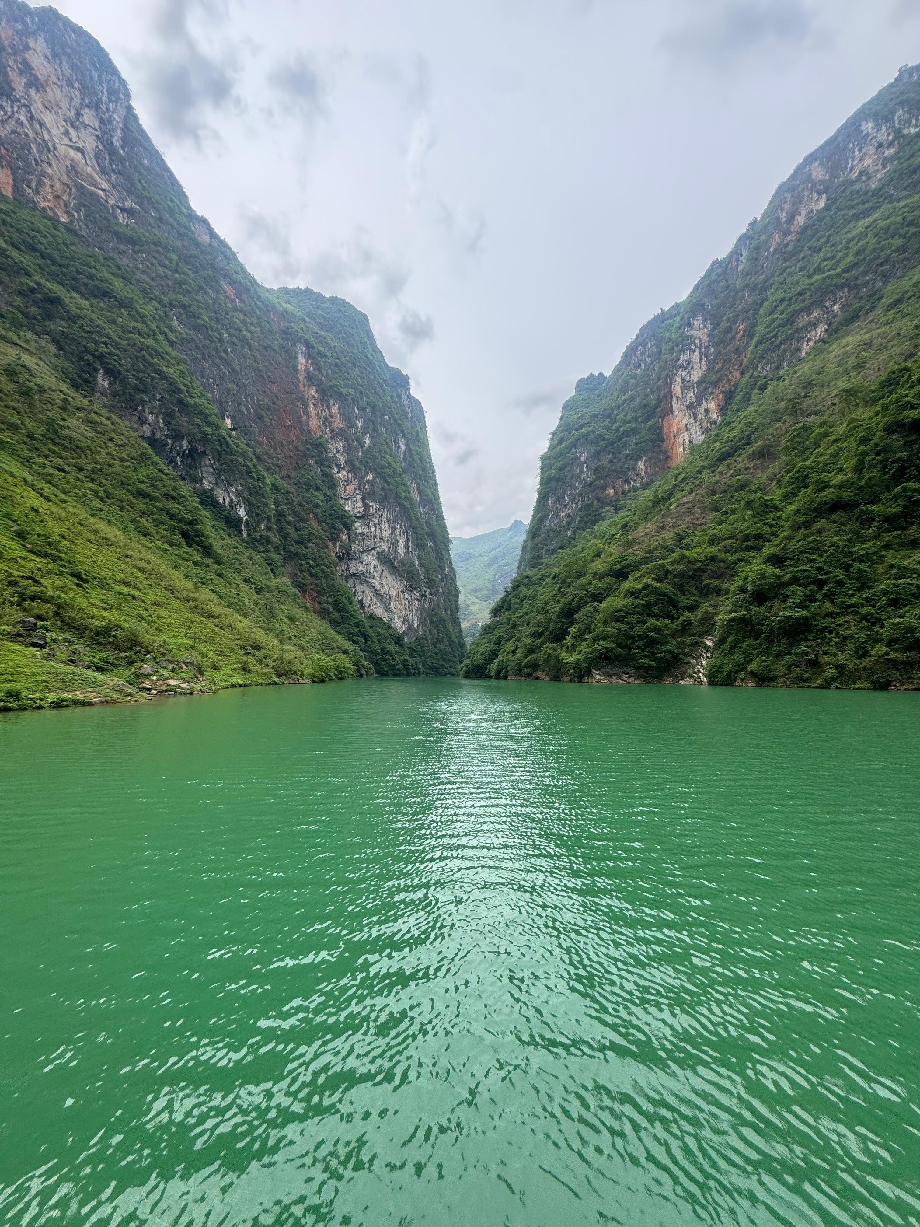 After lunch, we began a steep and rocky descent to the river, where our easy riders faced the delicate task of navigating terrain that looked more like a landslide than a road. I don’t think my quads have ever worked so hard from clenching in pure anticipation of falling off the bike. Once we finally reached the bottom, we hopped on a boat and cruised down the Nho Quế River through the very impressive Tu Sản Canyon, surrounded by towering limestone cliffs and emerald-green water. We pulled into Mèo Vạc for the night, ready for another homestay feast and, of course, a few more rounds of happy water.